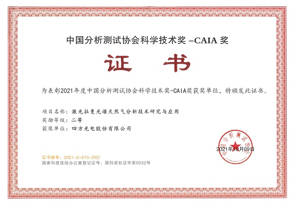 四方光电激光拉曼天然气分析技术荣获中国分析测试协会科学技术奖(CAIA奖)