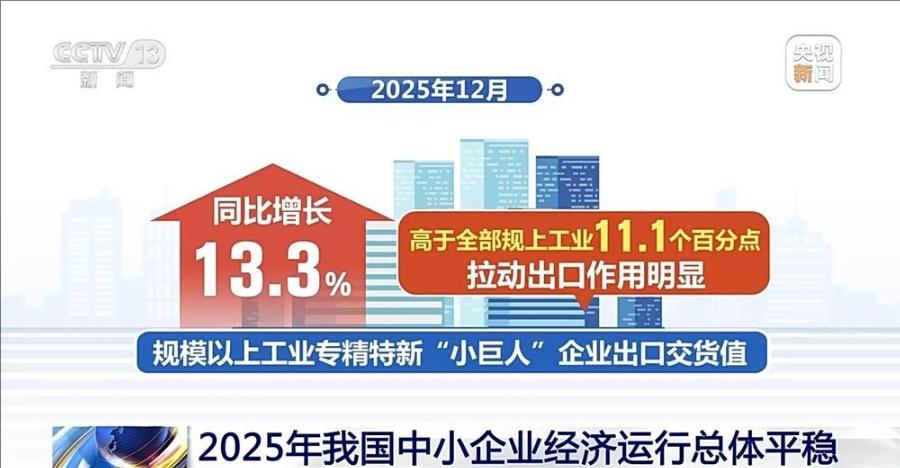 中小企业是经济韧性的重要支撑,2025年我国中小企业发展情况如何?记者在今天上午举行的国新办新闻发布会上拿到一组数据:2025年,我国规上工业中小企业增加值同比增长6.9%,12月 ...