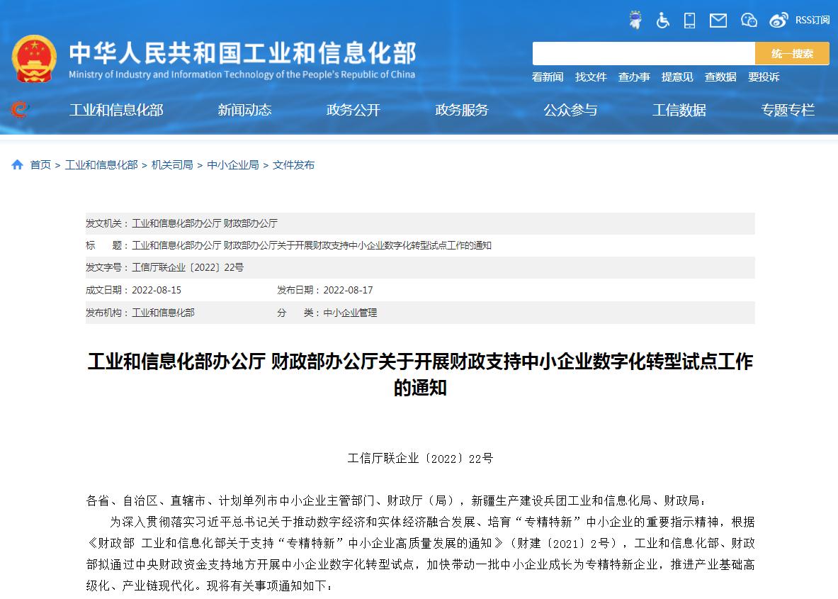 两部门开展财政支持中小企业数字化转型试点工作 促进专精特新发展