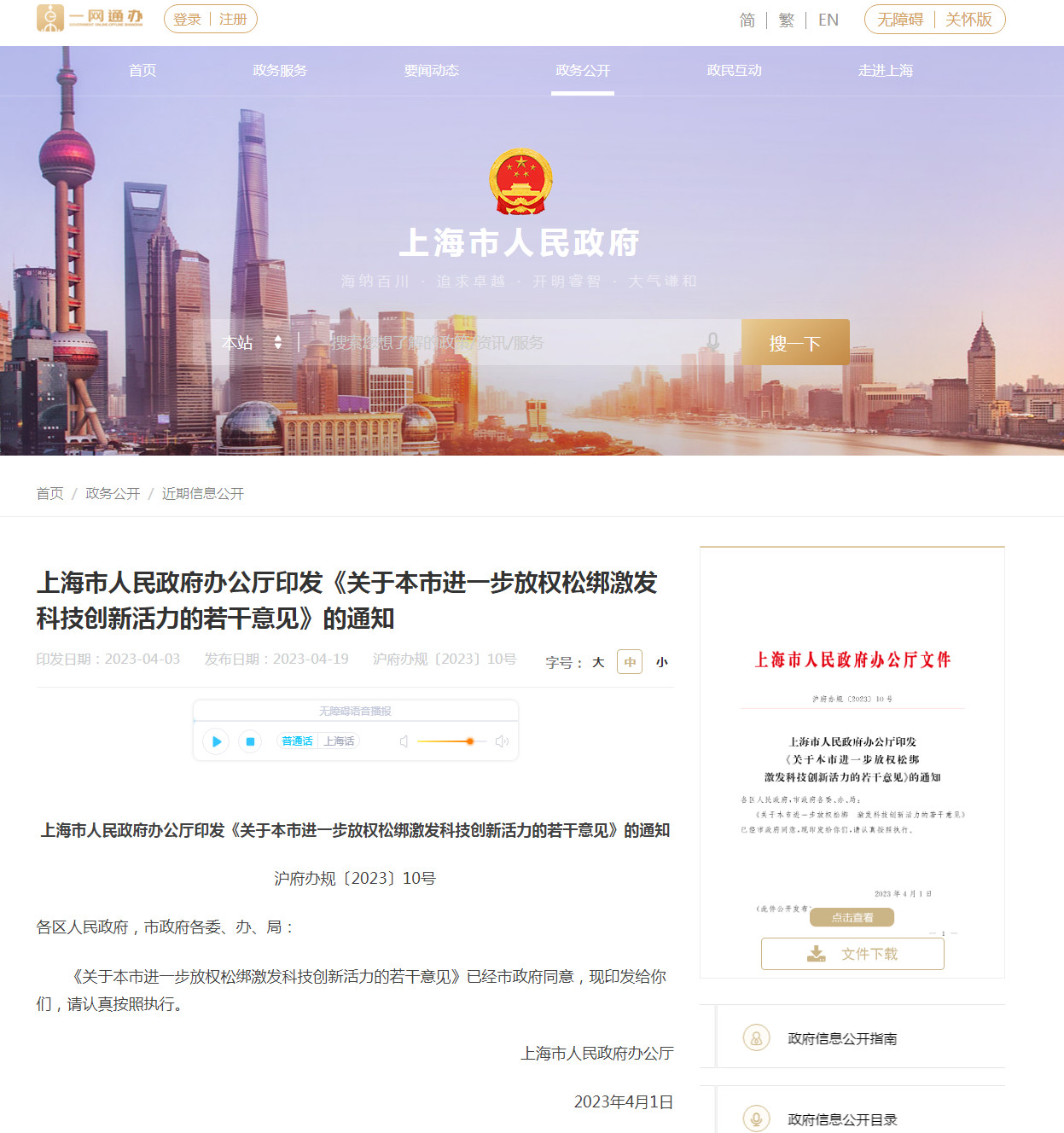 4月19日,上海市政府办公厅近日印发的《关于本市进一步放权松绑激发科技创新活力的若干意见》指出,扩大高校院所科研活动自主权,激发企业科技创新的活力和动力,促进新型研 ...