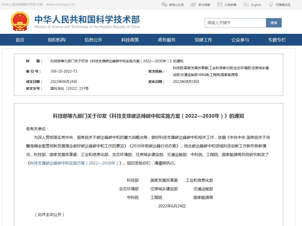 《科技支撑碳达峰碳中和实施方案(2022—2030年)》印发
