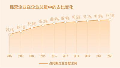 近日从国家市场监督管理总局获悉:2012―2021年,我国民营企业数量从1085.7万户增长到4457.5万户,10年间翻了两番,民营企业在企业总量中的占比由79.4%提高到92.1%,在稳定 ...