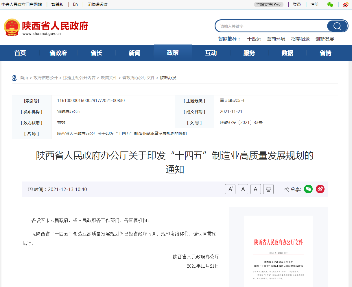 为加快推进全省制造业高质量发展,陕西省政府办公厅日前印发《陕西省“十四五”制造业高质量发展规划》(以下简称《规划》)。 《规划》主要目标为:到2025年,全省制造业 ...