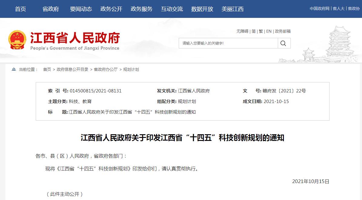 为推动科技创新助力高质量发展,日前,江西省政府发布《江西省“十四五”科技创新规划》(以下简称《规划》)。《规划》对“十四五”期间全省科技创新工作作出了总体部署,提 ...