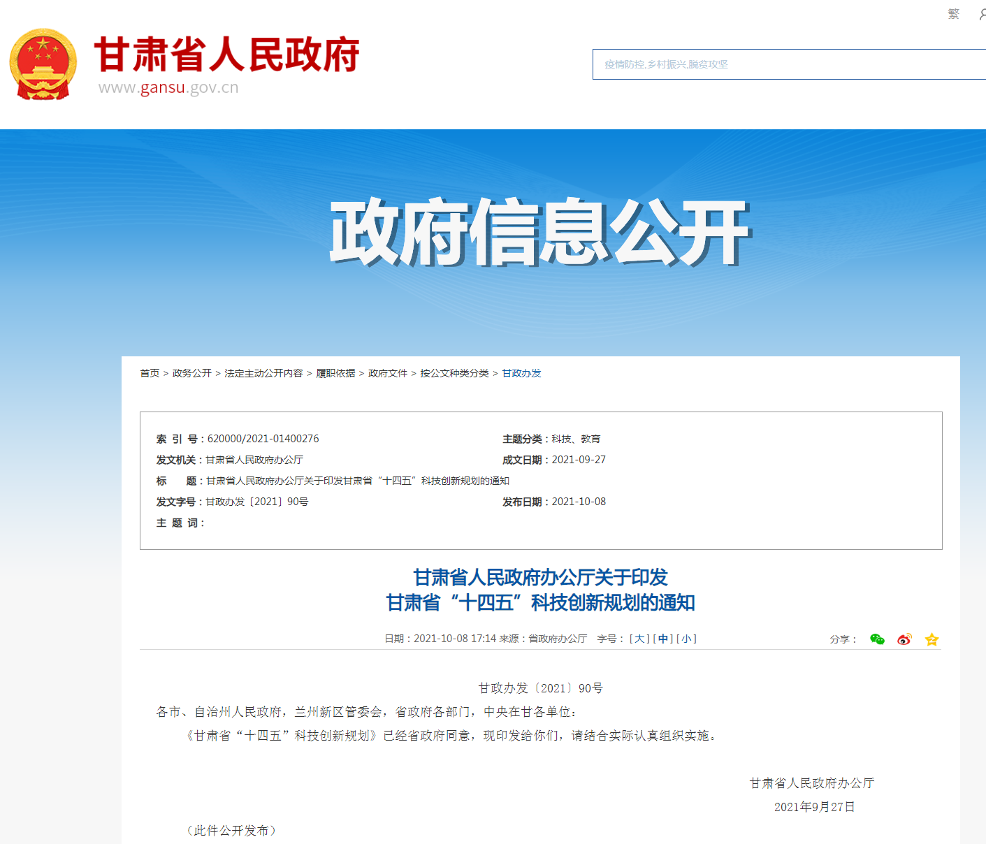 为深入实施创新驱动发展战略,推进创新型省份建设,甘肃省人民政府办公厅印发了《甘肃省“十四五”科技创新规划》(以下简称《规划》),明确了“十四五”时期甘肃省科技创新 ...
