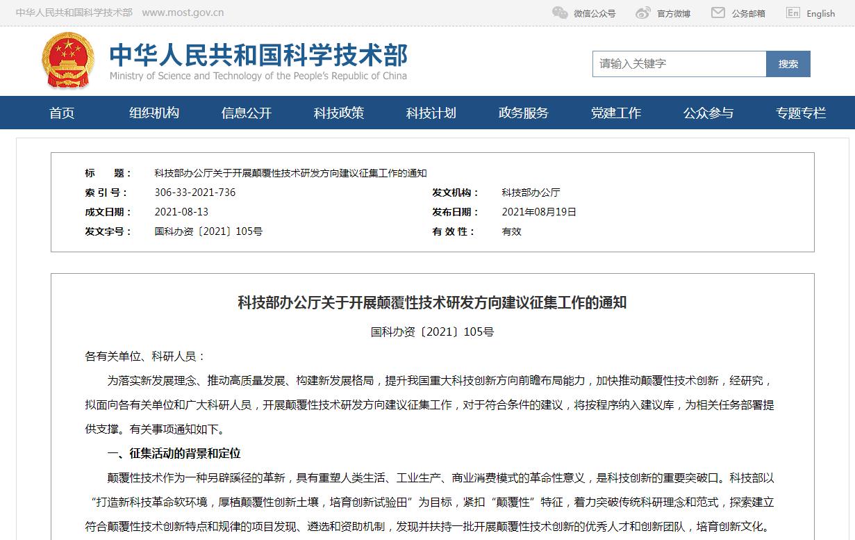 为贯彻落实党的十九大会议精神,推动科技创新在社会进步中发挥更大作用,探索符合颠覆性技术创新特点和规律的项目发现遴选机制,日前,科技部正式发布了《关于开展颠覆性技 ...