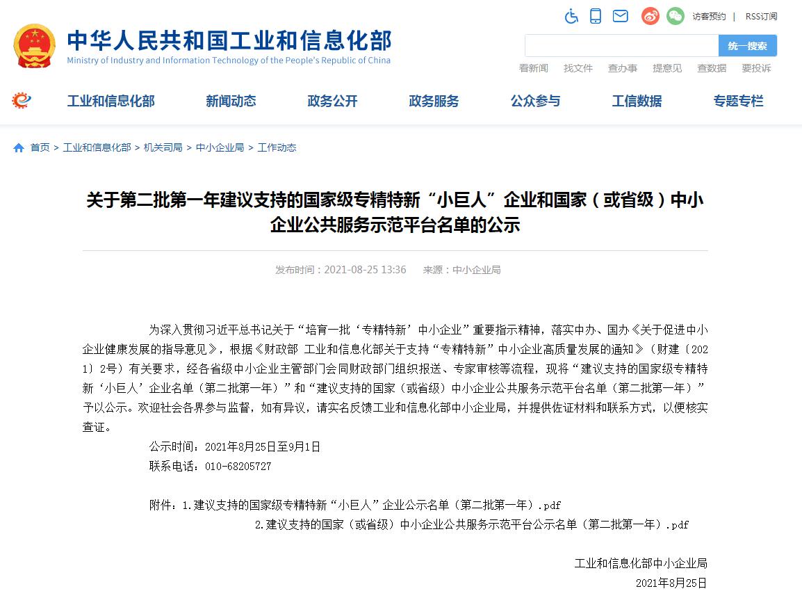 近日,工业和信息化部中小企业局发布《关于第二批第一年建议支持的国家级专精特新“小巨人”企业和国家(或省级)中小企业公共服务示范平台名单的公示》。为深入贯彻习近平总 ...