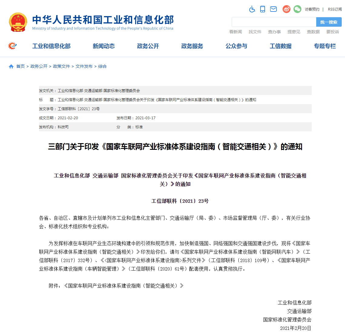 三部门关于印发《国家车联网产业标准体系建设指南(智能交通相关)》