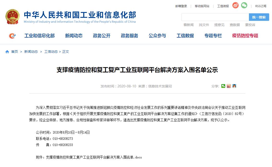工信部发布支撑疫情防控和复工复产工业互联网平台解决方案入围名单
