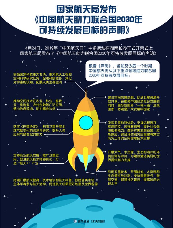 图表:国家航天局发布《中国航天助力联合国2030年可持续发展目标的声明》新华社发朱禹制图 4月24日,2019年“中国航天日”主场活动在湖南长沙正式开幕。开幕式上,国家航天 ...