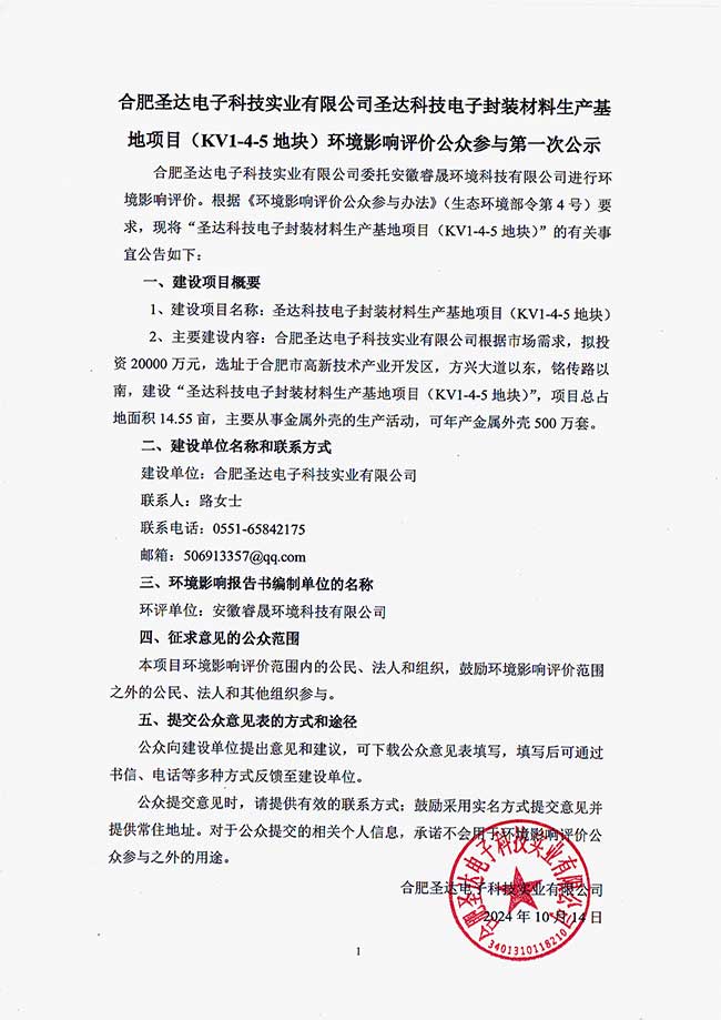 合肥圣达电子科技实业有限公司圣达科技电子封装材料生产基地项目(KV1-4-5地块)环境影响评价公众参与第一次公示