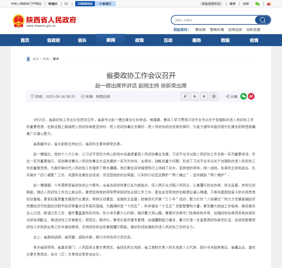 9月25日,陕西省委政协工作会议在西安召开。省委书记赵一德出席会议并讲话。他强调,要深入学习贯彻习近平总书记关于加强和改进人民政协工作的重要思想,在新征程上继 ...
