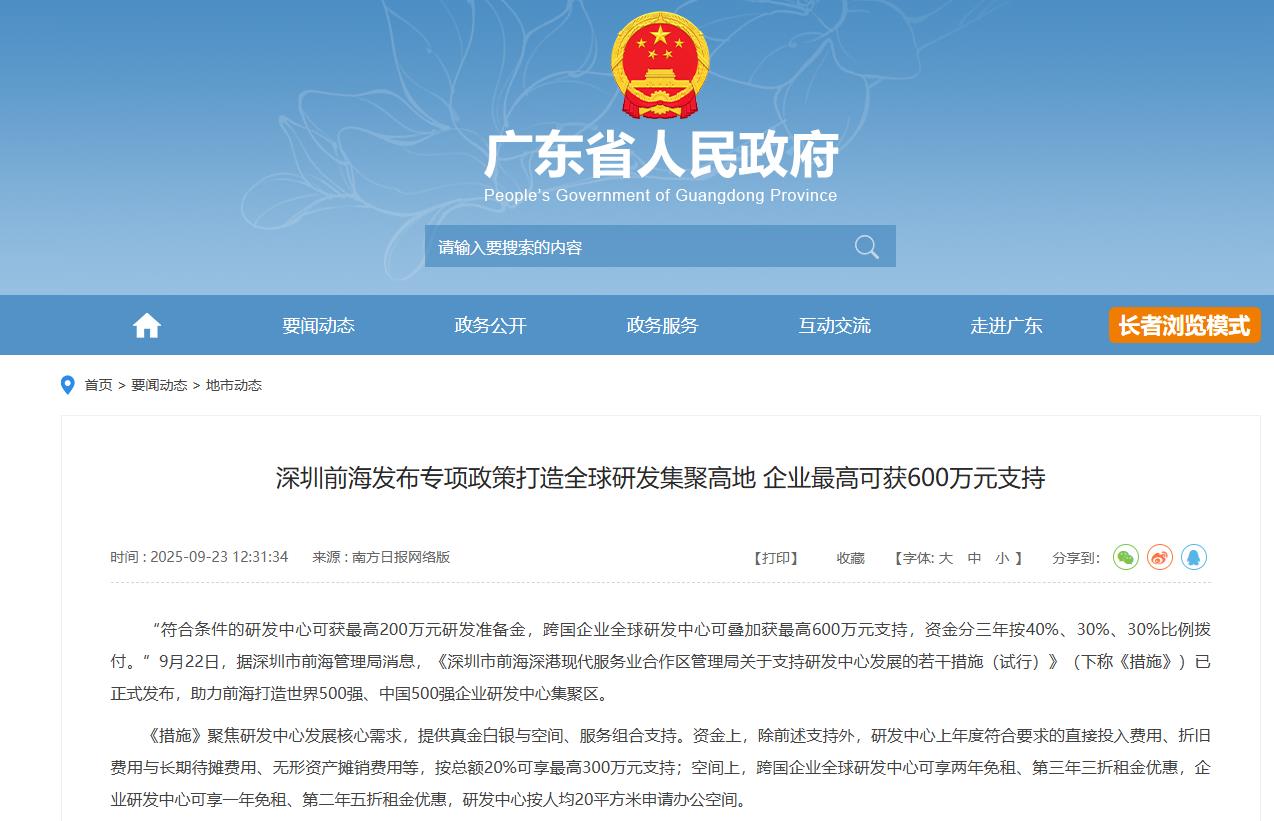 “符合条件的研发中心可获最高200万元研发准备金,跨国企业全球研发中心可叠加获最高600万元支持,资金分三年按40%、30%、30%比例拨付。”9月22日,据深圳市前海管理局消 ...