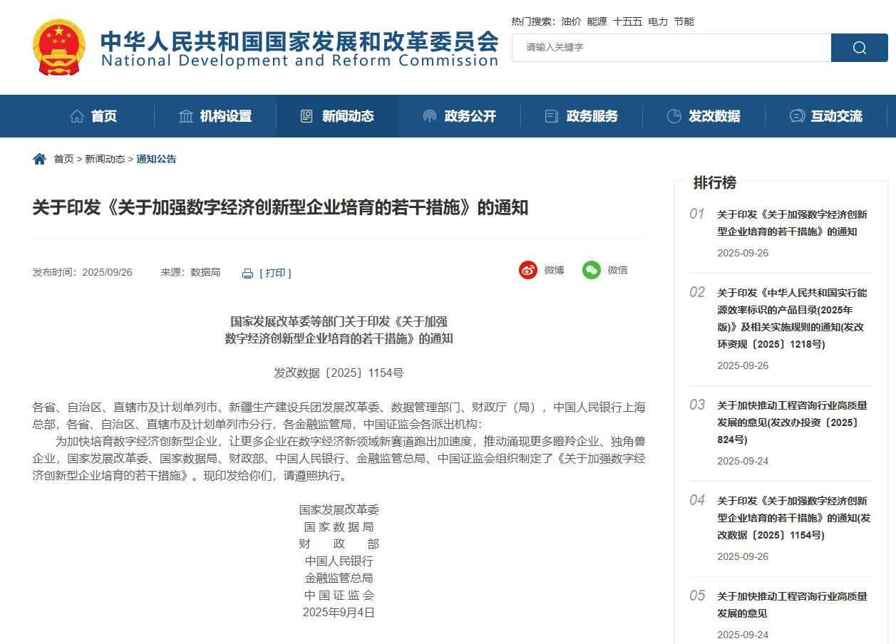 9月26日,由国家发展改革委、国家数据局、财政部等六部门联合印发的《关于加强数字经济创新型企业培育的若干措施》(以下简称《若干措施》)公布。 数字经济创新型企 ...