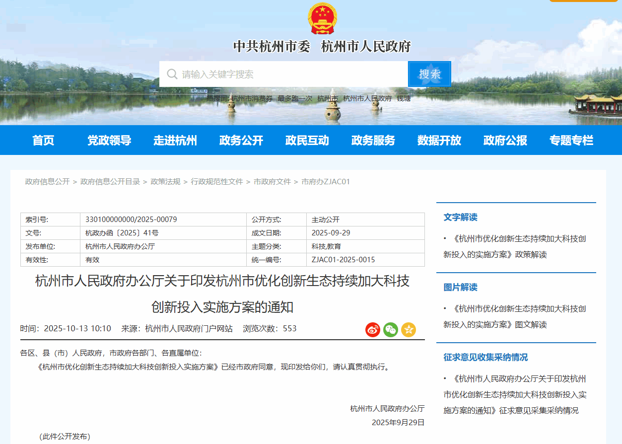 打造更高水平创新活力之城,杭州再添硬核支撑。日前,杭州市政府正式印发《杭州市优化创新生态持续加大科技创新投入实施方案》(以下简称“方案”),明确到2030年全市科技创新 ...