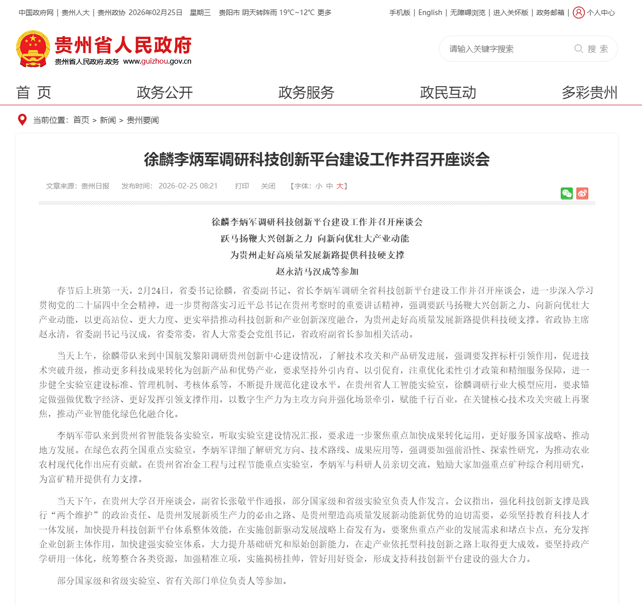 2月24日,贵州省委书记徐麟,省委副书记、省长李炳军调研全省科技创新平台建设工作并召开座谈会,进一步深入学习贯彻党的二十届四中全会精神,进一步贯彻落实习近平总 ...