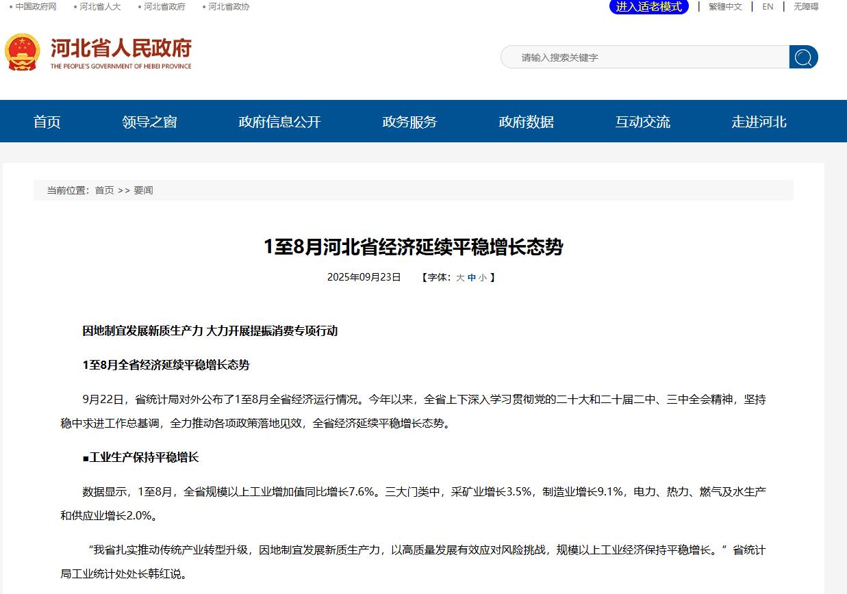 9月22日,河北省统计局对外公布了1至8月全省经济运行情况。今年以来,全省上下深入学习贯彻党的二十大和二十届二中、三中全会精神,坚持稳中求进工作总基调,全力 ...