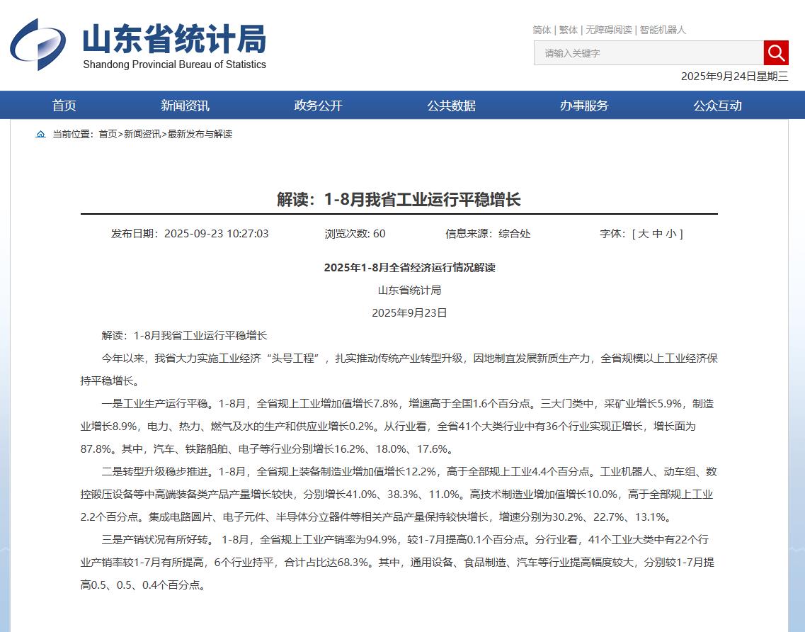 山东省统计局9月23日发布消息:今年前8个月,全省上下有效应对内外部不确定性,着力释放内需潜力、做强工业支撑、推动服务业发展、稳住外贸基本盘,多措并举推动经济回 ...