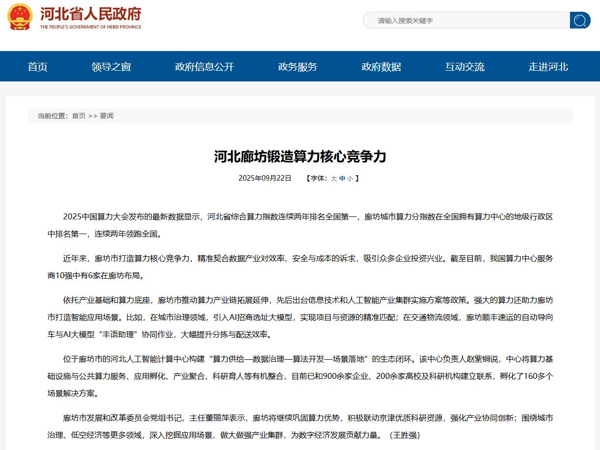 2025中国算力大会发布的最新数据显示,河北省综合算力指数连续两年排名全国第一,廊坊城市算力分指数在全国拥有算力中心的地级行政区中排名第一,连续两年领跑全国。 ...