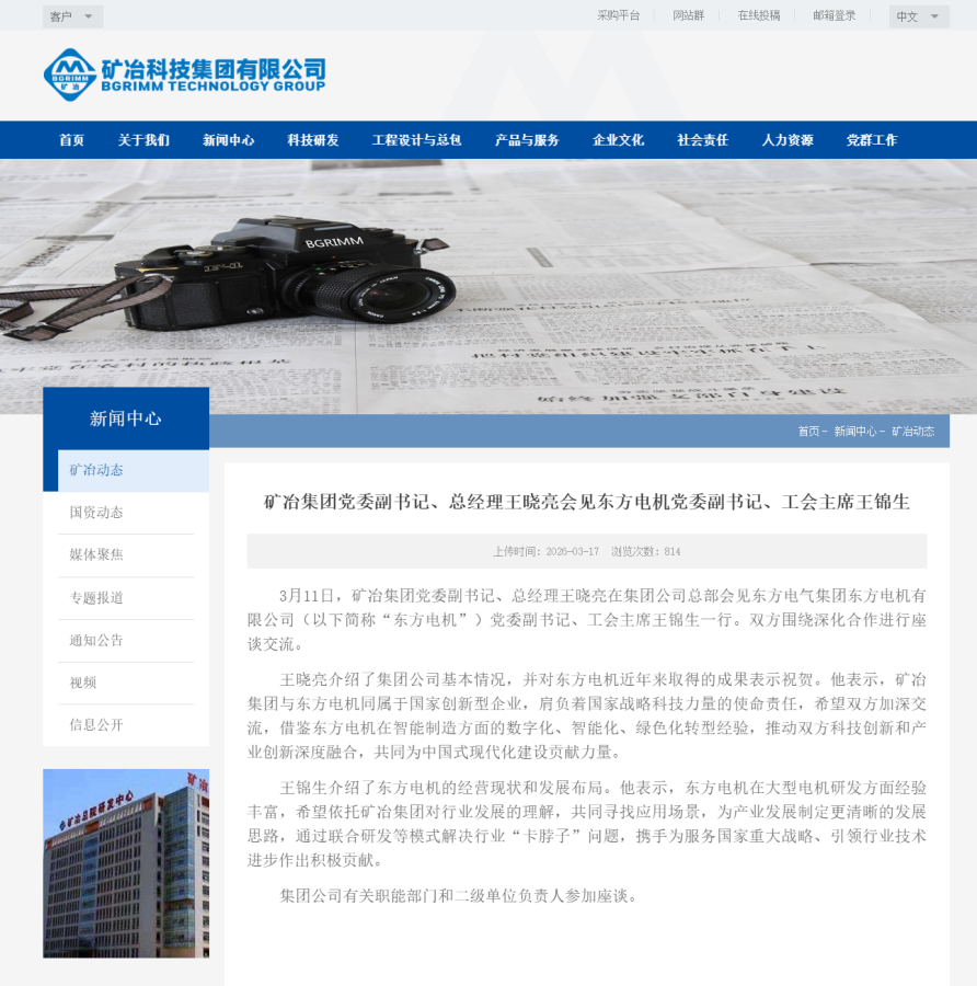 3月11日,矿冶集团党委副书记、总经理王晓亮在集团公司总部会见东方电气集团东方电机有限公司(以下简称“东方电机”)党委副书记、工会主席王锦生一行。双方围绕深化合作进行座谈交流。