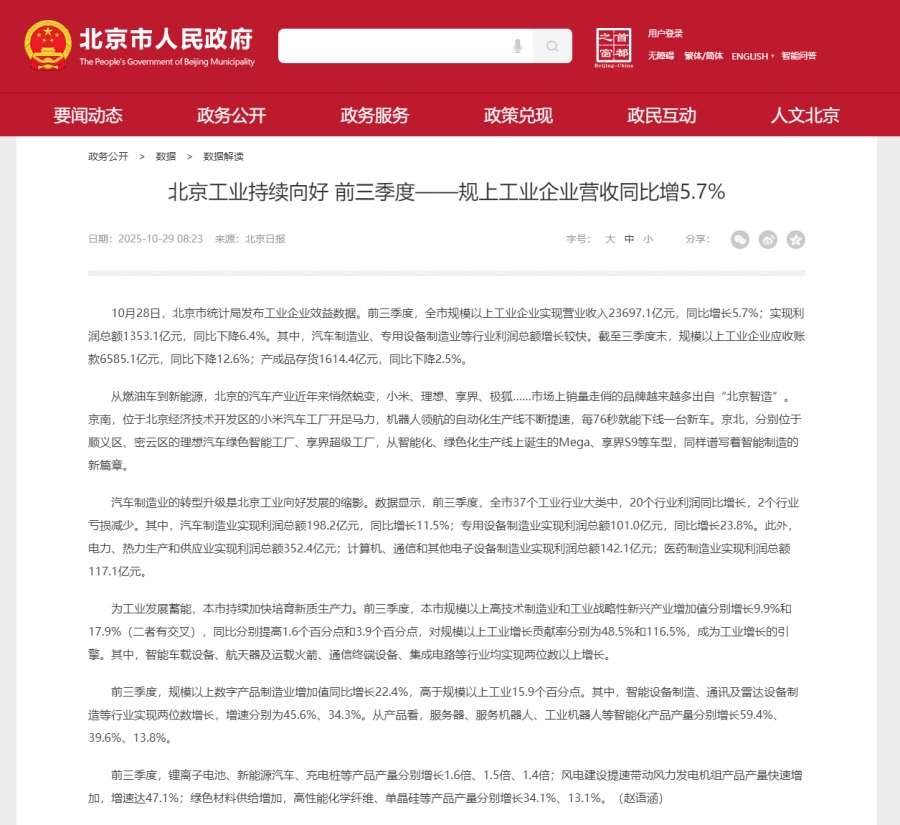 当前位置:首页 > 新闻资讯 > 北京工业持续向好 前三季度——规上工业企业营收同比增5.7%