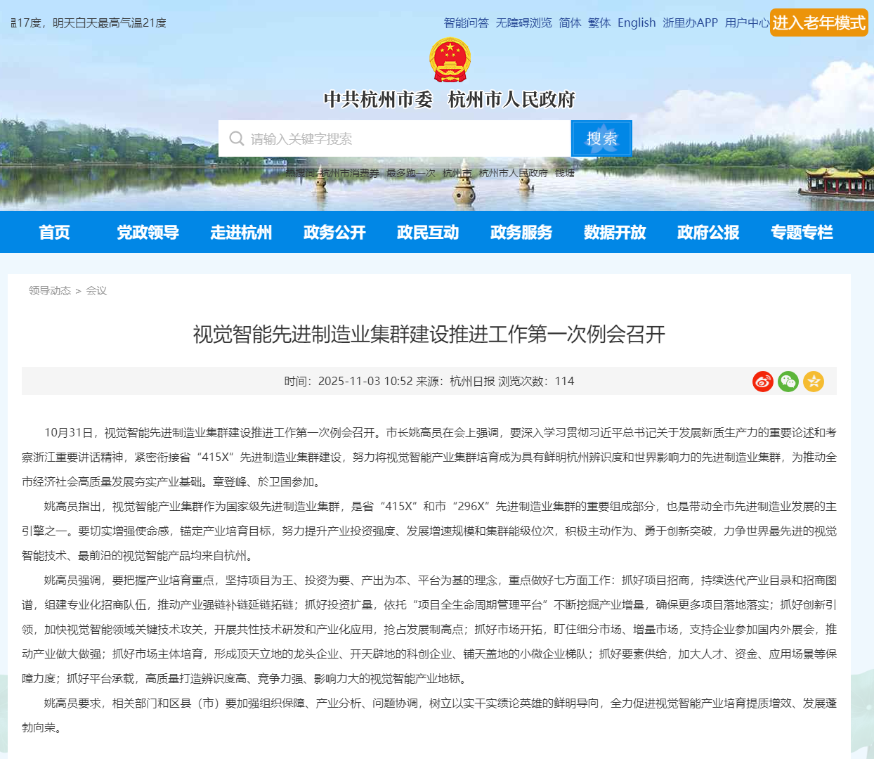 姚高员指出,视觉智能产业集群作为国家级先进制造业集群,是省“415X”和市“296X”先进制造业集群的重要组成部分,也是带动全市先进制造业发展的主引擎之一。要切实增强使命感,锚定产业培育目标,努力提升产业投资强度、发展增速规模和集群能级位次,积极主动作为、勇于创新突破,力争世界最先进的视觉智能技术、最前沿的视觉智能产品均来自杭州。