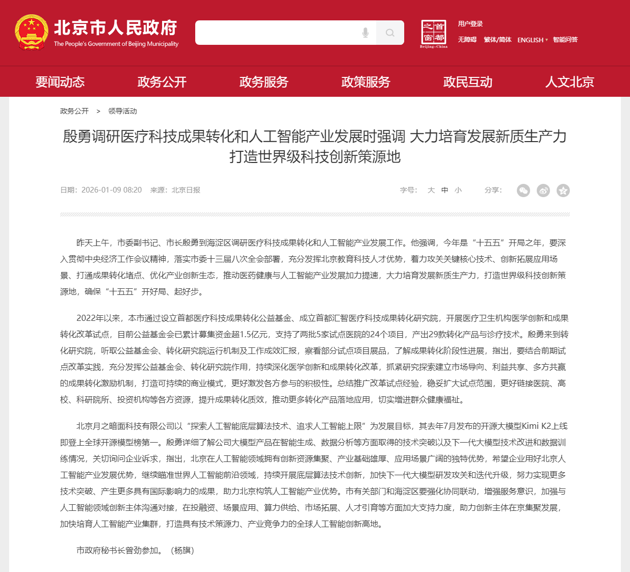 北京月之暗面科技有限公司以“探索人工智能底层算法技术、追求人工智能上限”为发展目标,其去年7月发布的开源大模型Kimi K2上线即登上全球开源模型榜第一。殷勇详细了解公司大模型产品在智能生成、数据分析等方面取得的技术突破以及下一代大模型技术改进和数据训练情况,关切询问企业诉求,指出,北京在人工智能领域拥有创新资源集聚、产业基础雄厚、应用场景广阔的独特优势,希望企业用好北京人工智能产业发展优势,继续瞄准世界人工智能前沿领域,持续开展底层算法技术创新,加快下一代大模型研发攻关和迭代升级,努力实现更多技术突破、产生更多具有国际影响力的成果,助力北京构筑人工智能产业优势。市有关部门和海淀区要强化协同联动,增强服务意识,加强与人工智能领域创新主体沟通对接,在投融资、场景应用、算力供给、市场拓展、人才引育等方面加大支持力度,助力创新主体在京集聚发展,加快培育人工智能产业集群,打造具有技术策源力、产业竞争力的全球人工智能创新高地。