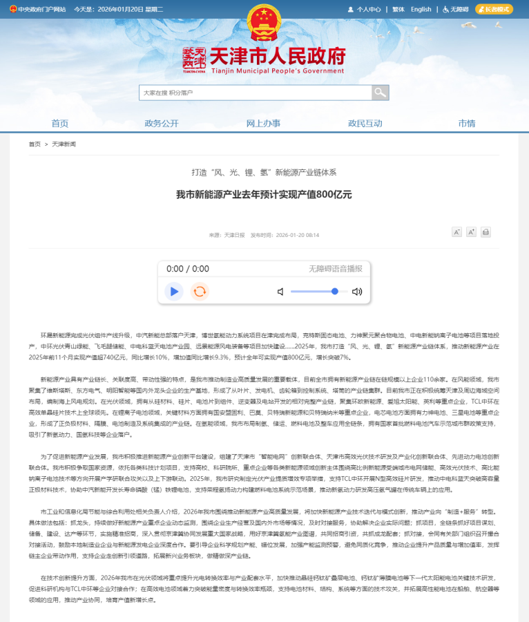 环晟新能源完成光伏组件产线升级,中汽新能总部落户天津,博世氢能动力系统项目在津完成布局,克特斯固态电池、力神聚元聚合物电池、中电新能钠离子电池等项目落地投产,中环光伏青山绿能、飞毛腿储能、中电科蓝天电池产业园、远景能源风电装备等项目加快建设……2025年,我市打造“风、光、锂、氢”新能源产业链体系,推动新能源产业在2025年前11个月实现产值超740亿元,同比增长10%,增加值同比增长9.3%,预计全年可实现产值800亿元,增长突破7%。