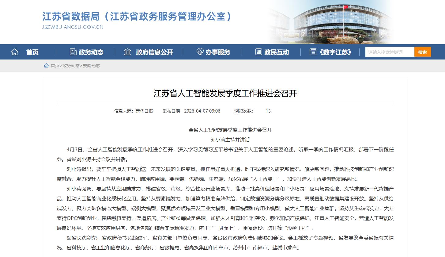4月3日,江苏省人工智能发展季度工作推进会召开,深入学习贯彻习近平总书记关于人工智能的重要论述,听取一季度工作情况汇报,部署下一阶段任务。省长刘小涛主持会议并讲话。
