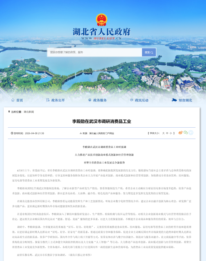 4月8日上午,湖北省委副书记、省长李殿勋在武汉市调研消费品工业时强调,要准确把握我国发展新的历史方位,敏锐感知当前社会主要矛盾与总体供需格局的深刻复杂变化,以更加科学务实的举措,引导支持和服务保障各类企业大力开展产品技术创新、商业模式创新和经营管理创新,加快推动全省食品饮料、纺织服装、家用电器等消费品工业重塑发展竞争新优势。