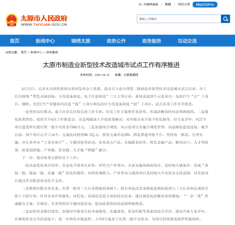 4月15日,从太原市政府新闻办新闻发布会上获悉,我市自入选全国第二批制造业新型技术改造城市试点以来,市工信局围绕“黑色金属冶炼、专用设备制造、电子信息制造”三大主导行业,系统谋划20个示范项目,包括17个“点”上项目,钢铁、光伏2个产业链协同改造“线”上项目和综改区专用设备制造“面”上项目,试点各项工作有序推进。