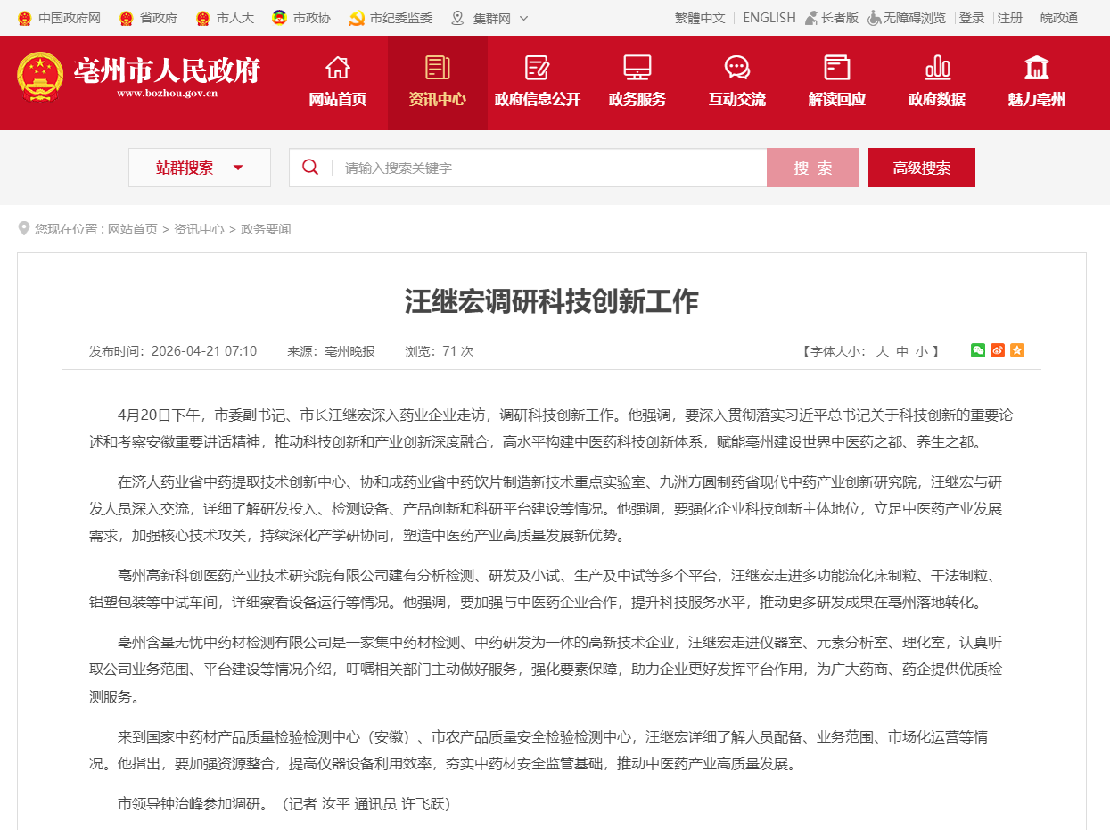 4月20日下午,亳州市委副书记、市长汪继宏深入药业企业走访,调研科技创新工作。他强调,要深入贯彻落实习近平总书记关于科技创新的重要论述和考察安徽重要讲话精神,推动科技创新和产业创新深度融合,高水平构建中医药科技创新体系,赋能亳州建设世界中医药之都、养生之都。