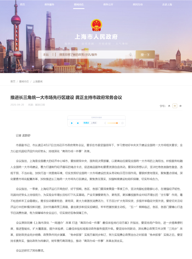 上海市委副书记、市长龚正4月27日主持召开市政府常务会议,要求在市委坚强领导下,学习贯彻好中央关于建设全国统一大市场相关要求 全力以赴巩固经济回升向好势头 持续深化“高效办成一件事”改革。