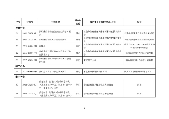 国务院标准化协调推进部际联席会议(简称联席会议)第三次全体会议审议同意上述整合精简结论。根据联席会议办公室《关于印发强制性标准整合精简结论的通知》(国标委综合函〔2017〕4号),现决定对《变电、整流安全技术规范》等35项强制性行业标准计划项目(不含工程建设领域强制性行业标准计划项目)进行调整(详见附件),其中《变电、整流安全技术规范》等7项计划项目终止,《锗单晶安全生产规范》等13项计划项目转为推荐性行业标准计划项目,《井矿盐工业矿山安全管理规范》等15项计划项目需调整为强制性国家标准计划项目。