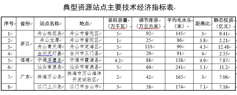 在上述资源普查站点基础上,考虑地形条件、工程布置、节约淡水资源等多方面因素,进一步筛选出建设条件相对较好的8个典型站点,分布在浙江、福建、广东3省,作为下一步研究重点。(具体见附件2)