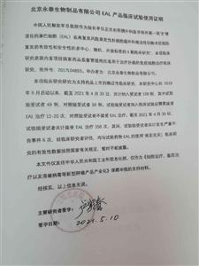 作为EAL系列产品的试验,已完成入组。产品制备工艺具有较先进的智能化制造并实现规模化生产,全程无动物质添加,建议产品质量控制标准。持有很多专利。具有较高的经济效益。
