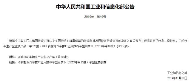 11月13日,工信部发布第325批《道路机动车辆生产企业及产品公告》,公布了获许可的汽车、摩托车、三轮汽车生产企业及产品(第325批)和《新能源汽车推广应用推荐车型目录》(2019年第10批)。