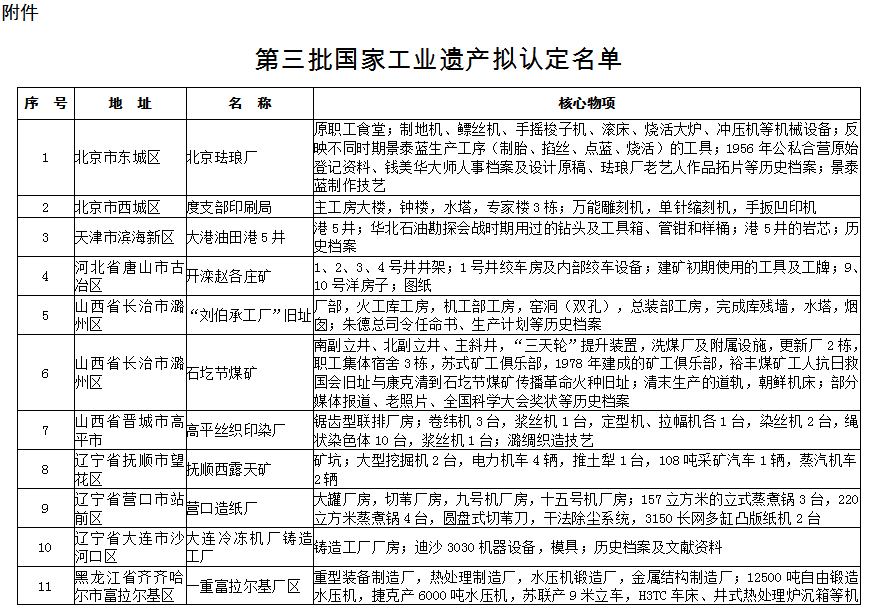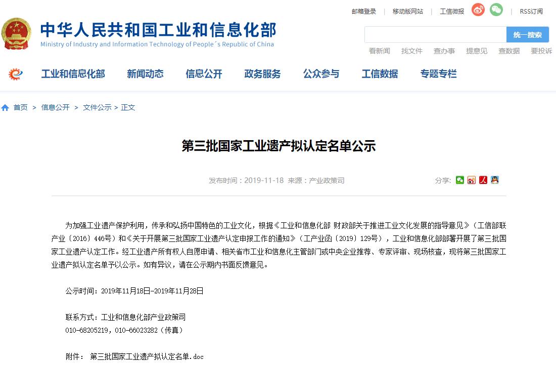 工信部消息,经工业遗产所有权人自愿申请、相关省市工业和信息化主管部门或中央企业推荐、专家评审、现场核查,工信部现将第三批国家工业遗产拟认定名单予以公示。