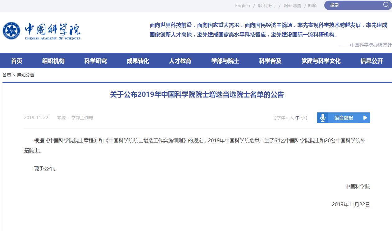 今天(11月22日),两年一度的中国科学院院士增选结果公布。