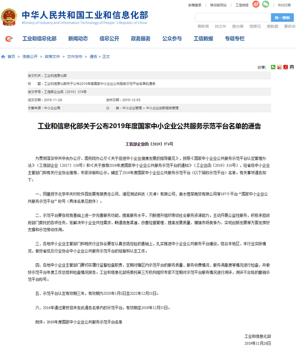 同意授予北京中关村软件园发展有限责任公司、谱尼测试科技(天津)有限公司、衡水煜荣商贸有限公司等197个平台“国家中小企业公共服务示范平台”称号。示范平台认定有效期三年,有效期为2020年1月1日至2022年12月31日。