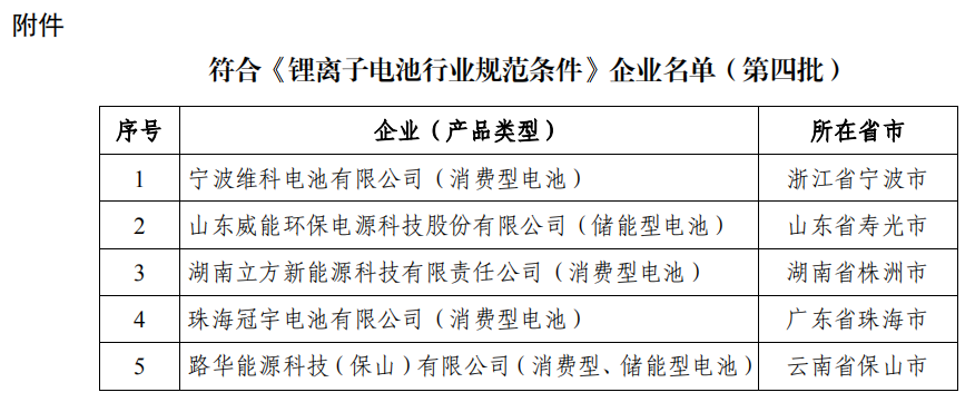 符合《锂离子电池行业规范条件》企业名单(第四批)
