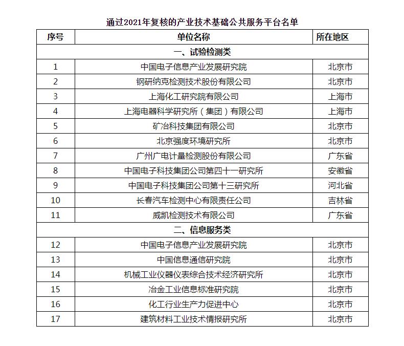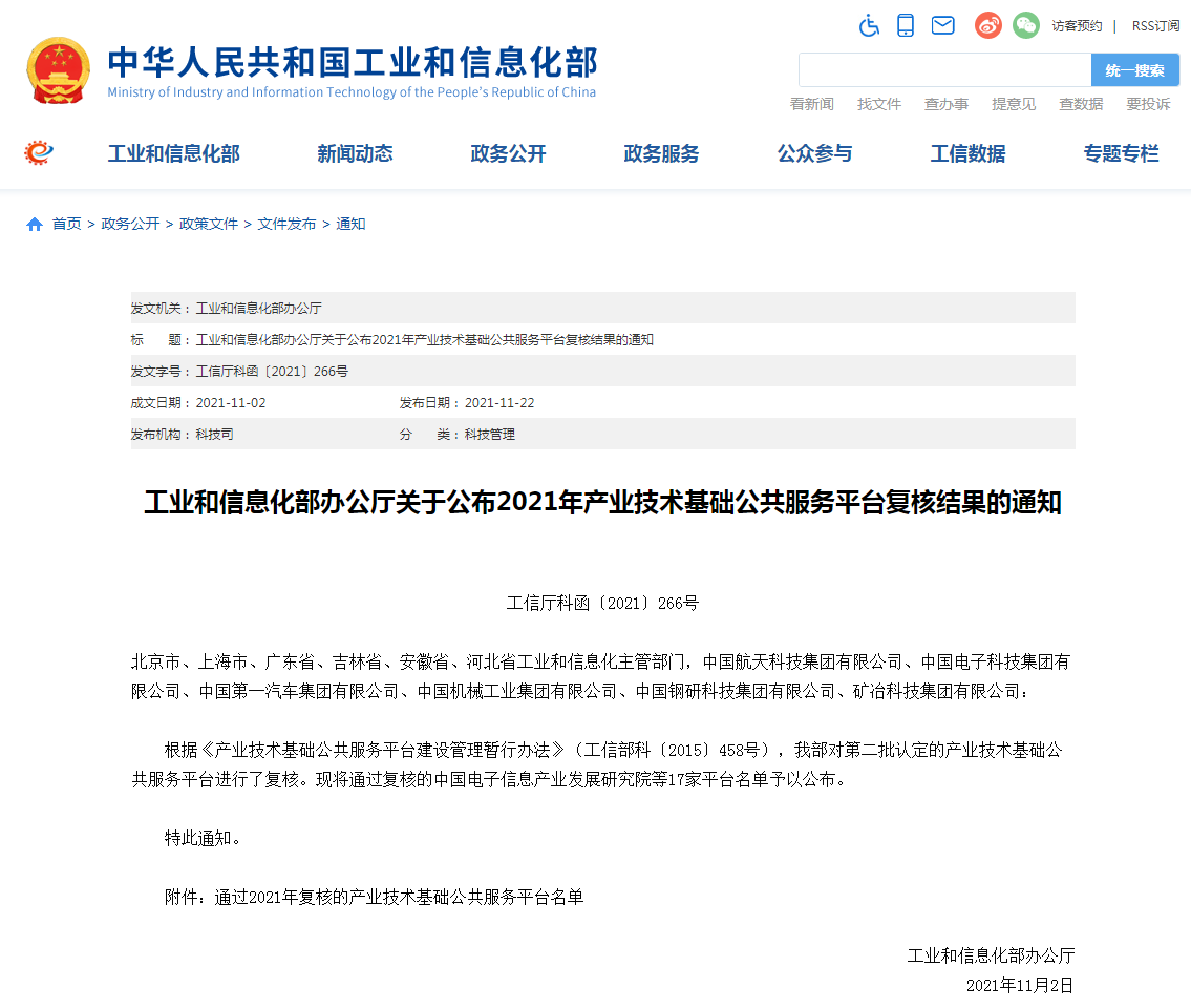 近日,工业和信息化部办公厅发布《工业和信息化部办公厅关于公布2021年产业技术基础公共服务平台复核结果的通知 工信厅科函〔2021〕266号》。根据《产业技术基础公共服务平台建设管理暂行办法》(工信部科〔2015〕458号),我部对第二批认定的产业技术基础公共服务平台进行了复核。现将通过复核的中国电子信息产业发展研究院等17家平台名单予以公布。