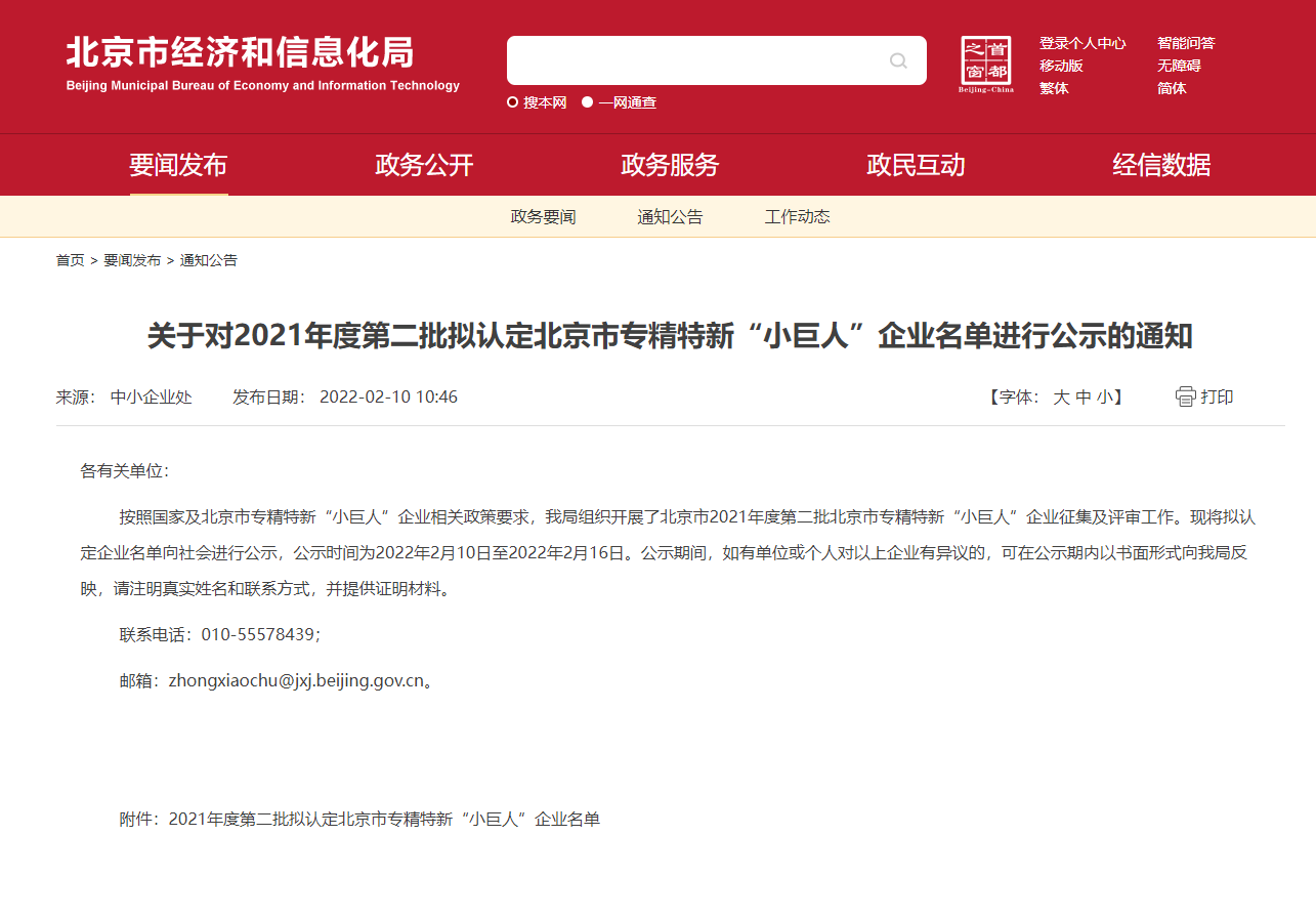 近日,北京市经济和信息化局官方网站发布了《关于对2021年度第二批拟认定北京市专精特新“小巨人”企业名单进行公示的通知》,北京天宜上佳高新材料股份有限公司(以下简称“天宜上佳”)成功上榜。