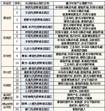 深圳市工业和信息化局有关负责人表示,深圳充分考虑全市各区产业基础、发展规划、空间承载等情况,在宝安、龙岗、龙华、坪山、光明、盐田、大鹏新区、深汕特别合作区等8个区域,选取产业基础比较好、具有空间保障能力的区域打造20大先进制造业园区,其中宝安区(含前海)4个、龙岗区3个、龙华区3个、坪山区3个、光明区4个、盐田区和大鹏新区合建1个、深汕特别合作区2个。