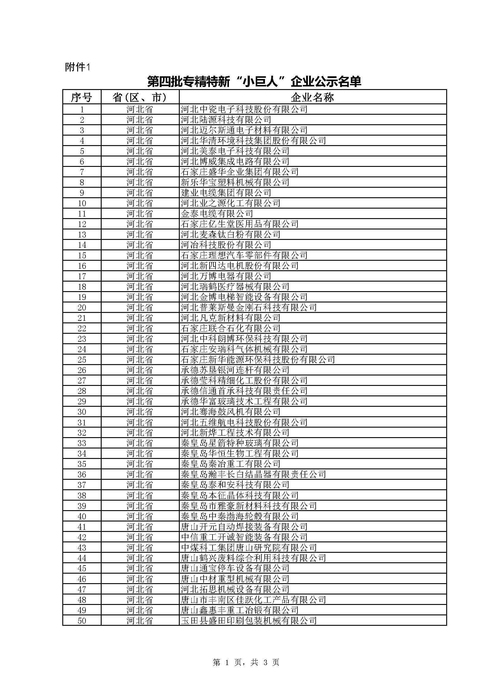 近日,河北省工业和信息化厅发布《关于河北省第四批专精特新“小巨人”企业和第一批专精特新“小巨人”复核通过企业名单的公示》。为深入贯彻习近平总书记关于“培育一批‘专精特新’中小企业”的重要指示精神,落实中办、国办《关于促进中小企业健康发展的指导意见》,工业和信息化部开展了第四批专精特新“小巨人”企业培育和第一批专精特新“小巨人”企业复核工作,已完成相关审核,现将我省通过审核的企业名单予以公示(见附件1、2、3)。此外,有部分已认定的专精特新“小巨人”企业进行了简单更名,一并将经申请并通过审核的简单更名企业名单予以公示(附件3)。公示时间:2022年8月8日至8月12日。