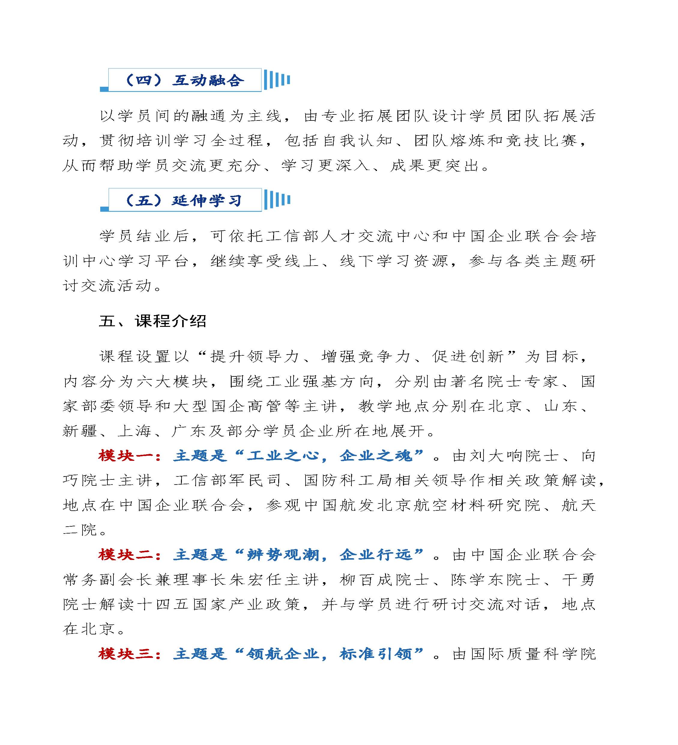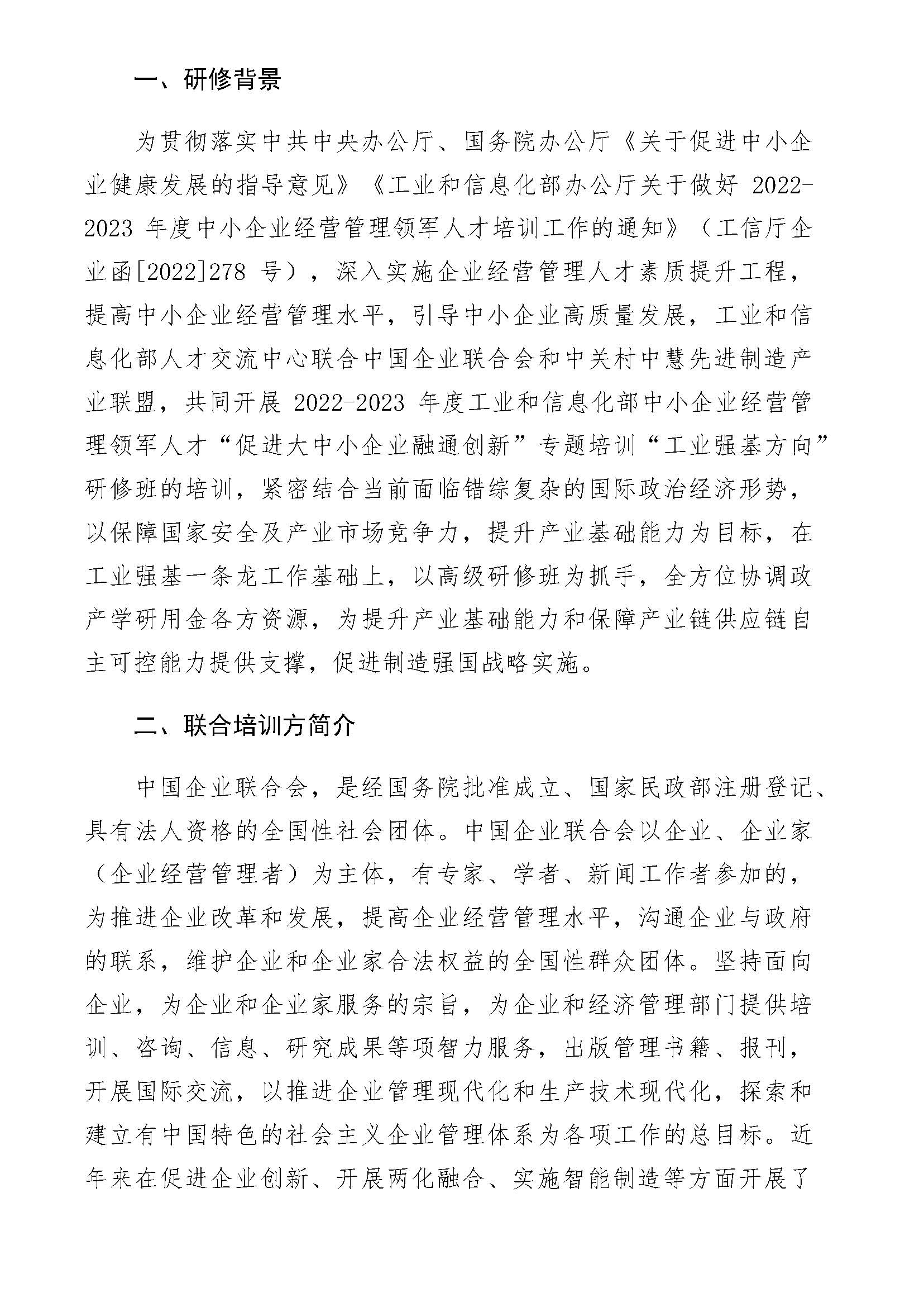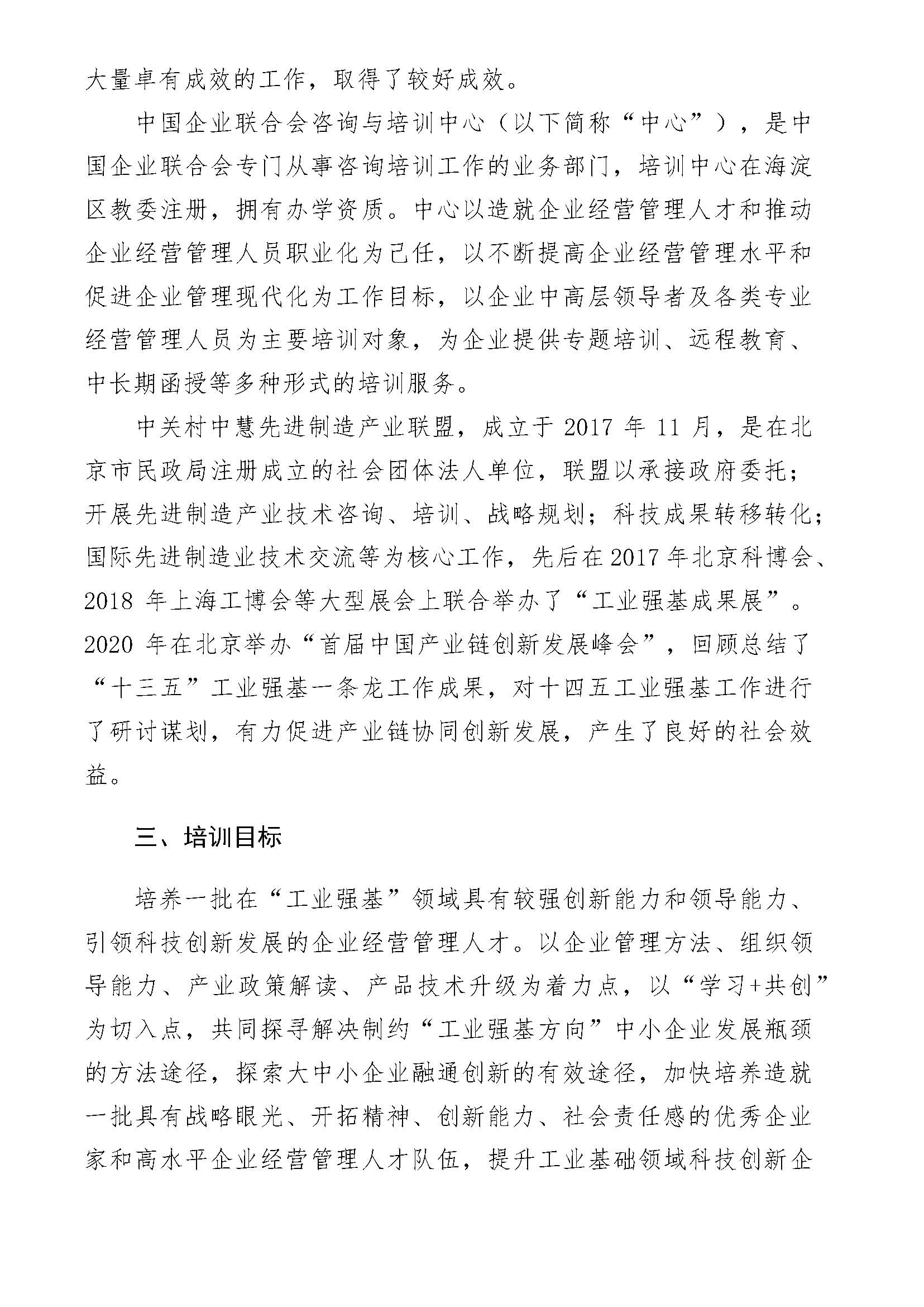 培养一批在“工业强基”领域具有较强创新能力和领导能力、引领科技创新发展的企业经营管理人才。以企业管理方法、组织领导能力、产业政策解读、产品技术升级为着力点,以“学习+共创”为切入点,共同探寻解决制约“工业强基方向”中小企业发展瓶颈的方法途径,探索大中小企业融通创新的有效途径,加快培养造就一批具有战略眼光、开拓精神、创新能力、社会责任感的优秀企业家和高水平企业经营管理人才队伍,提升工业基础领域科技创新企业经营发展能力和管理者的领导力,促进企业融通、创新、发展。