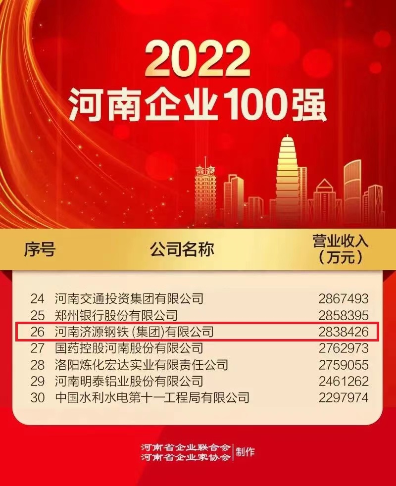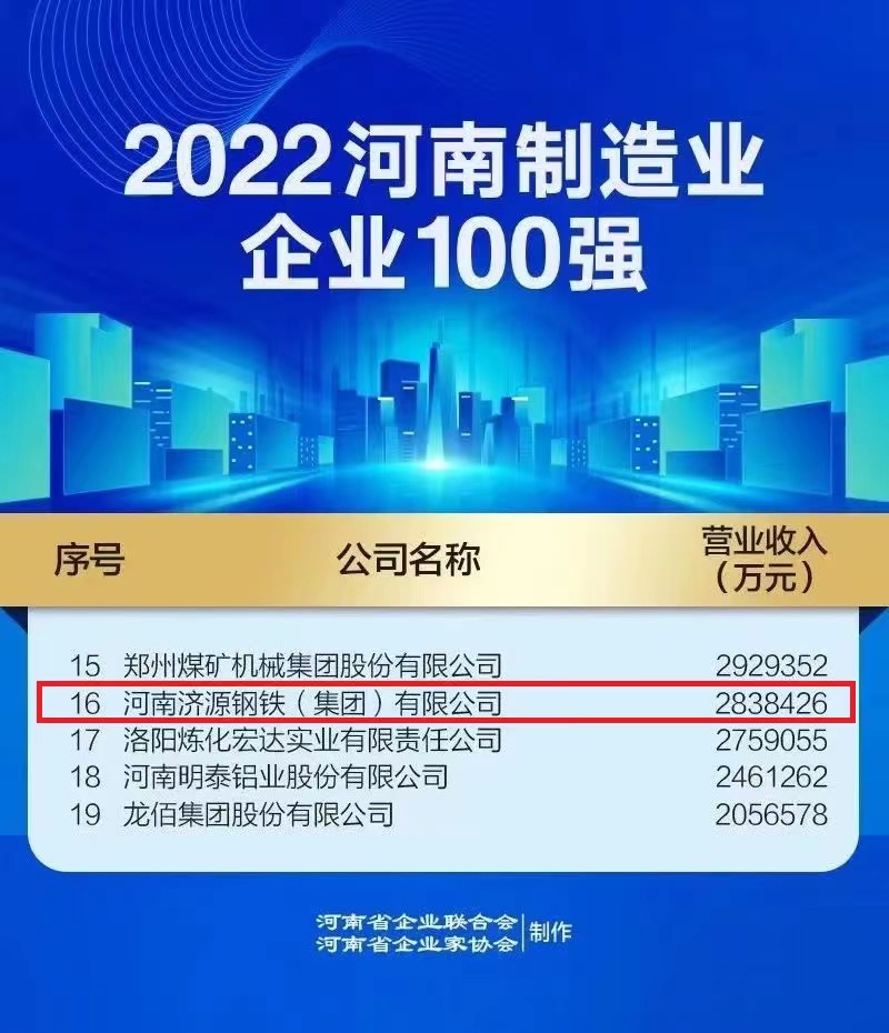 济源钢铁上榜,位居2022河南企业100强第26位,2022河南制造业企业100强第16位。