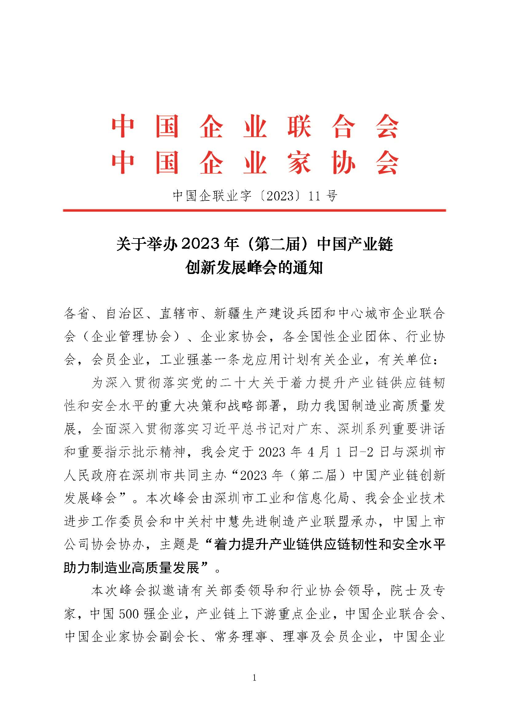 为深入贯彻落实党的二十大关于着力提升产业链供应链韧性和安全水平的重大决策和战略部署,助力我国制造业高质量发展,全面深入贯彻落实习近平总书记对广东、深圳系列重要讲话和重要指示批示精神,我会定于2023年4月1日-2日与深圳市人民政府在深圳市共同主办“2023年(第二届)中国产业链创新发展峰会”。本次峰会由深圳市工业和信息化局、我会企业技术进步工作委员会和中关村中慧先进制造产业联盟承办,中国上市公司协会协办,主题是“着力提升产业链供应链韧性和安全水平 助力制造业高质量发展”。