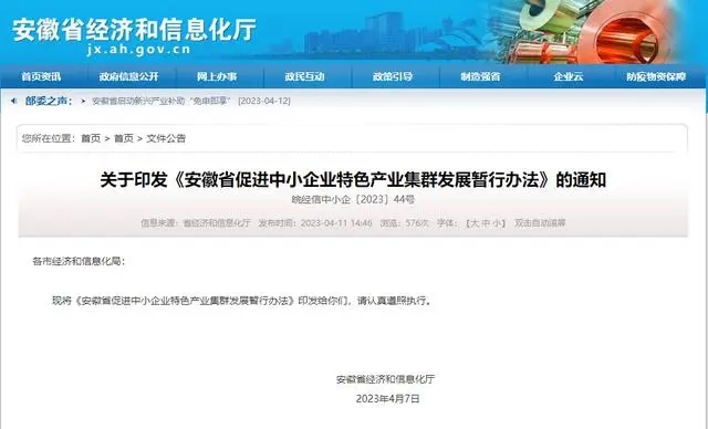 近日, 安徽省促进中小企业特色产业集群发展暂行办法印发,并同时公布安徽省中小企业特色产业集群认定标准。