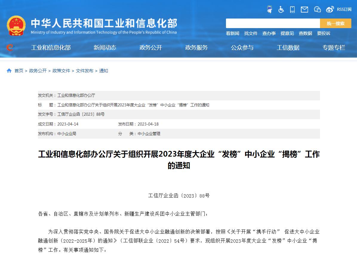 促进大中小企业融通创新(2022-2025年)的通知》(工信部联企业〔2022〕54号)要求,工信部办公厅发布关于组织开展2023年度大企业“发榜”中小企业“揭榜”工作的通知(以下简称通知)。